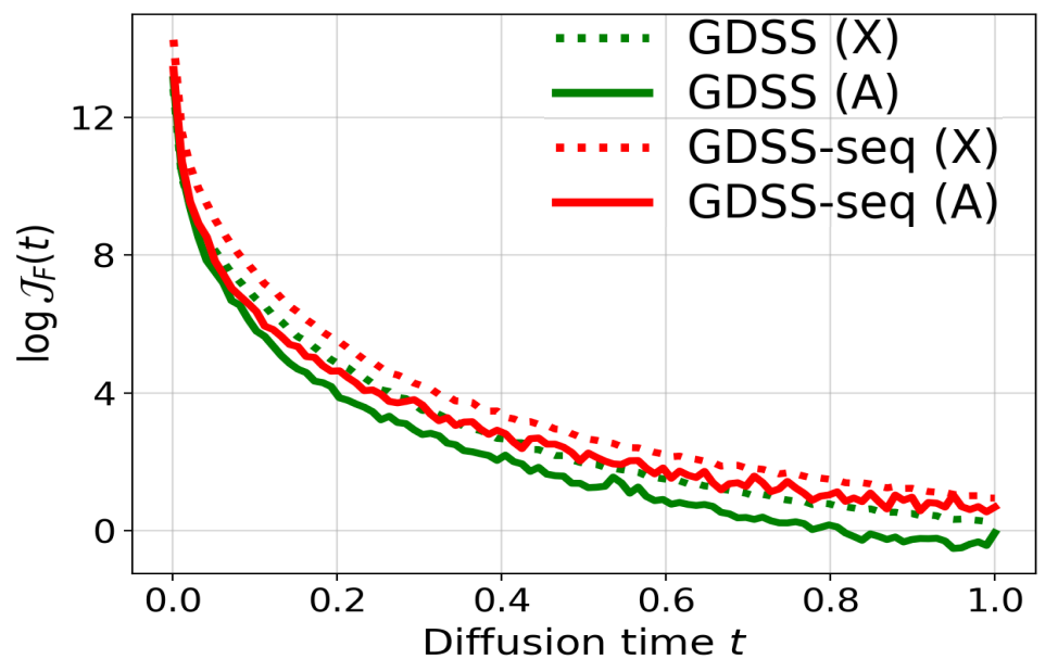 \[\nabla_{A_t} \log p_t(X_t, A_t) \quad \text{and} \quad \nabla_{X_t} \log p_t(X_t, A_t)\]This counterintuitive result highlights a key strength of GDSS that, learning the true joint dynamics between node features and edges not only improves generative performance (as shown in Table 1), but also simplifies the optimization landscape. The reduced Jacobian norms suggest that joint modeling provides smoother, more learnable gradients, enabling more stable and efficient training.