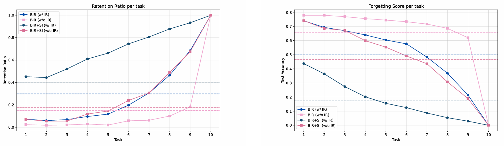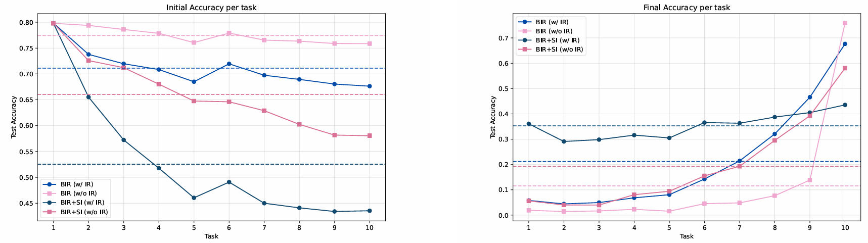However, IR also reduces initial accuracy, indicating a stability–plasticity trade-off.