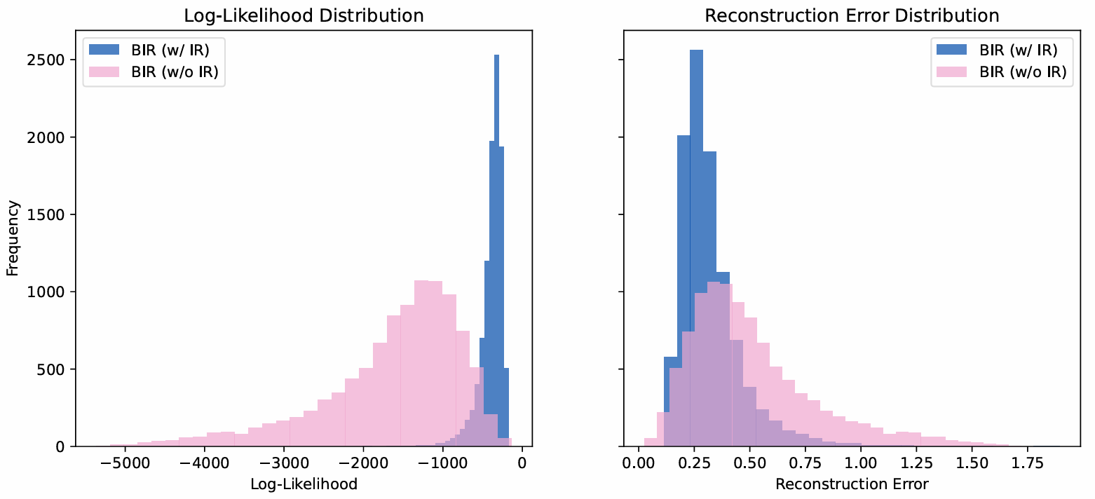 IR models fit the data better (higher log-likelihood, lower reconstruction error).